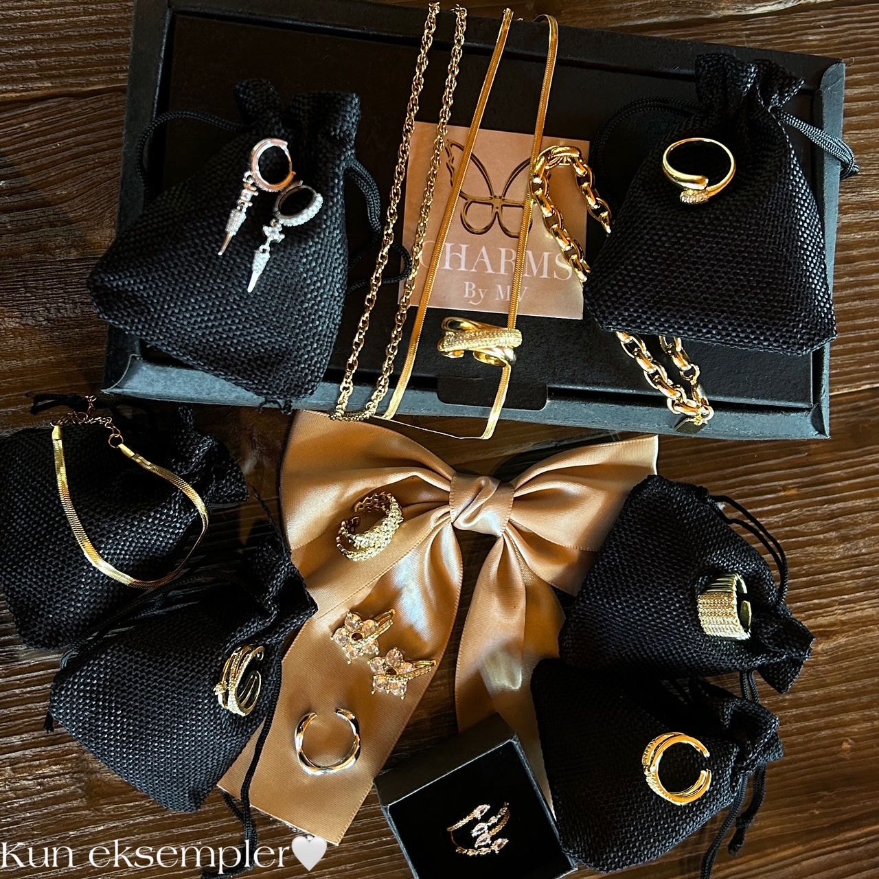 4 x halskjede, 6 x par øredobber, 7 ringer, 2 x ear cuff, 2 x charms, 4 x armbånd,❤️ Ulikheter i produktsammensetningen kan forekomme, men det er dette som er utgangspunkt når lukene settes sammen. Verdi er ca 4050-4100 kr.